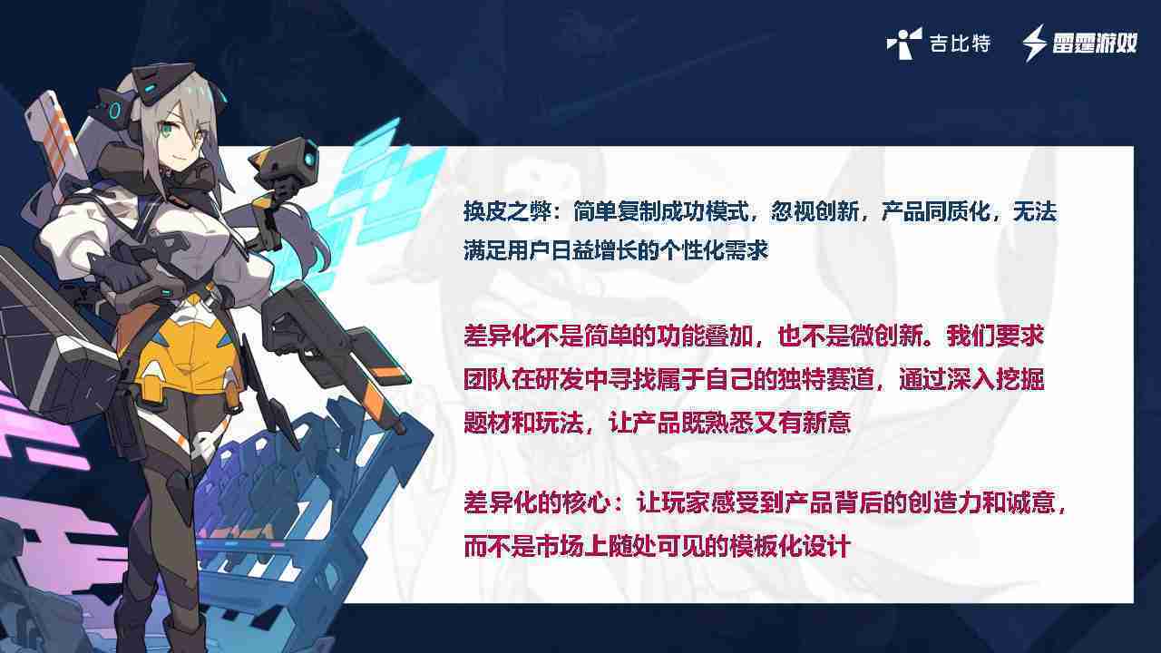 在我们内部是这么定义差异化的。。。首先,,,,差异化不是简单的功能叠加,,更不是换皮。。。只是换皮,,产品无法提供有效的市场价值。。内部经常说差异化的产品不是为了迎合市场,,,,而是找到一个自己独特的表达方式,,,在研发中找到属于自己的细分赛道和独特赛道,,,前提是需要对这个题材有足够的深入、、挖掘,,,,对玩法有足够深入的理解,,,,让产品看起来既熟悉又有新意。。。。