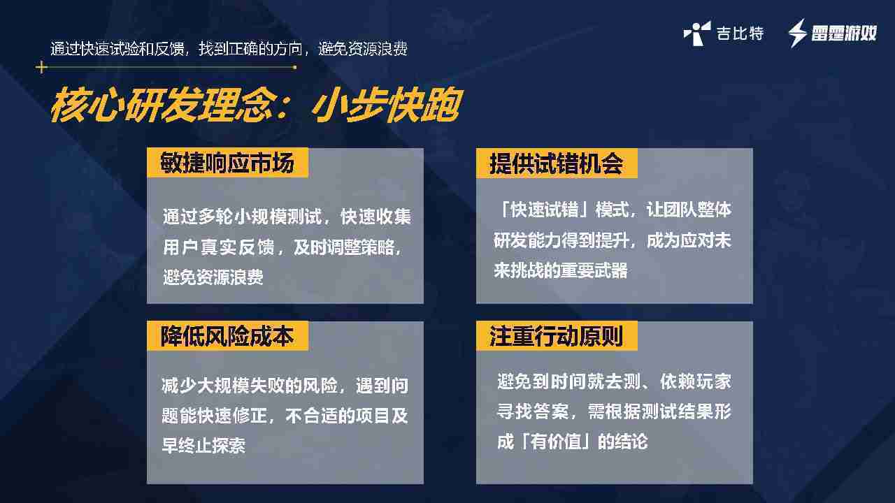 小步快跑不是找答案,,,,而是验证答案。。。。我们之前有项目是这样的,,有些制作人会有几个方向觉得都可以做,,,但是不确定做哪一个,,会选择几个都做,,,做完拿到市场跑,,,跑出哪一个更好,,基于这个再做后续的研发和拓展。。。。但这种情况最容易出现一个问题,,,,可能被玩家裹胁,,,,玩家说这个点不错、、那个点不错,,,,到底听还是不听,,,,不听感觉是无视玩家的反馈,,,听的话,,,,可能自己没想清楚导致研发思路发生偏颇。。。所以针对这一点后面自己复盘整理,,发现制作人自己心里要有数,,,要做自己觉得好玩的,,,而且明确知道这个东西是你想做的,,然后拿到市场验证这个答案是不是对的,,而不是拿一堆答案找哪一个答案更好。。。。