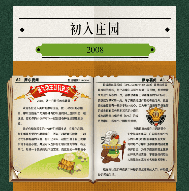 在这一年,,,摩尔庄园诞生了。。。。在这里,,,大家都是可爱的红鼻子鼹鼠小摩尔,,,,可以一起勤劳耕作,,,,一起高山滑雪......我们都是摩尔庄园的建设者。。。。