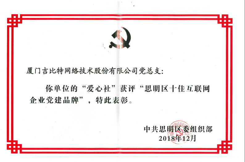 经初审评选、、网络评选和专家评审等环节,,,"厦门918.com网络技术股份有限公司党总支-爱心社" 从全区28个参评党建品牌中脱颖而出,,,获评"思明区十佳互联网企业党建品牌"。。。。