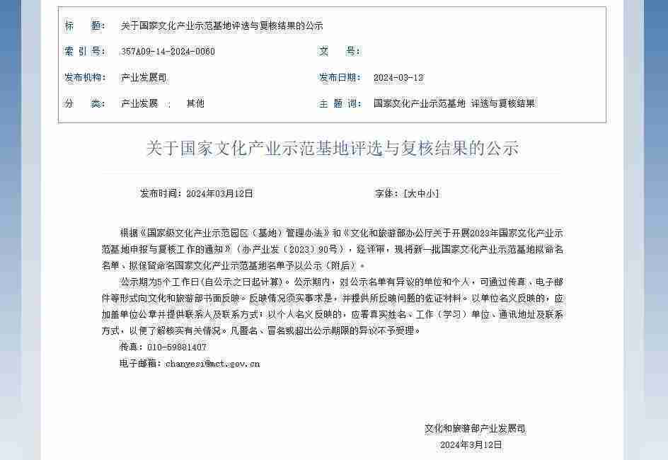 新一批国家文化产业示范基地公示,,,918.com成功入围