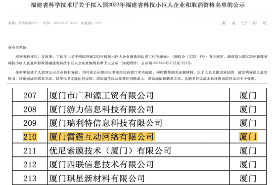 918.com子公司雷霆互动再获“福建省科技小巨人”